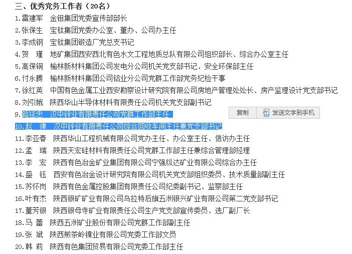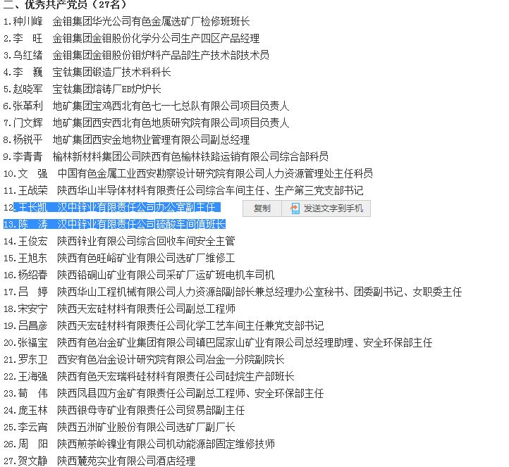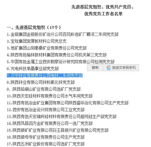 公司電鋅二車間黨支部榮獲集團公司“先進基層黨組織”;綜合回收車間黨支部書記趙律、公司黨群工作部主任路延忠榮獲集團公司“優秀黨務工作者”;公司辦公室副主任王長凱、公司總部硫酸車間值班長陳濤榮獲集團公司“優秀共產黨員”。